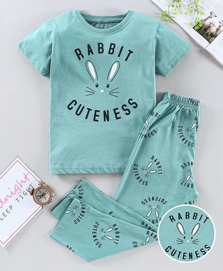 Cotton Half Sleeve Night Suit With Cute Printed - Blue