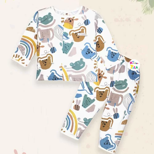Muslin Half Sleeve Night Suit With Cute Printed - Cream